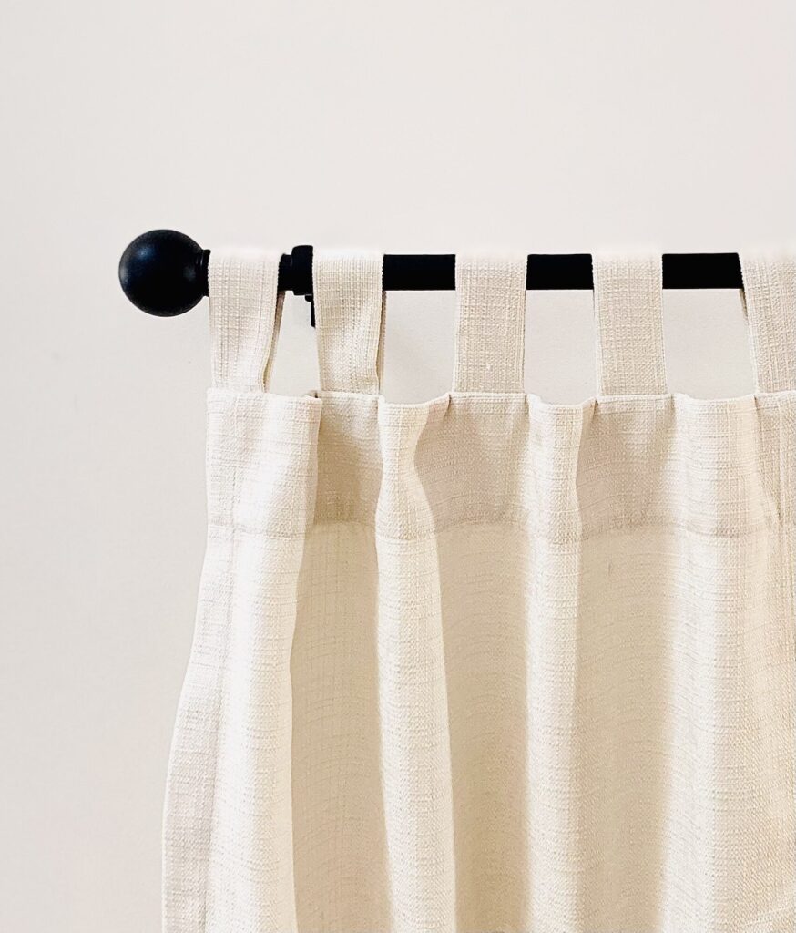 Tab Top Tab top curtains feature exposed loops of fabric along the top. These wrap around the rod and support the weight of the curtain. Request a quote